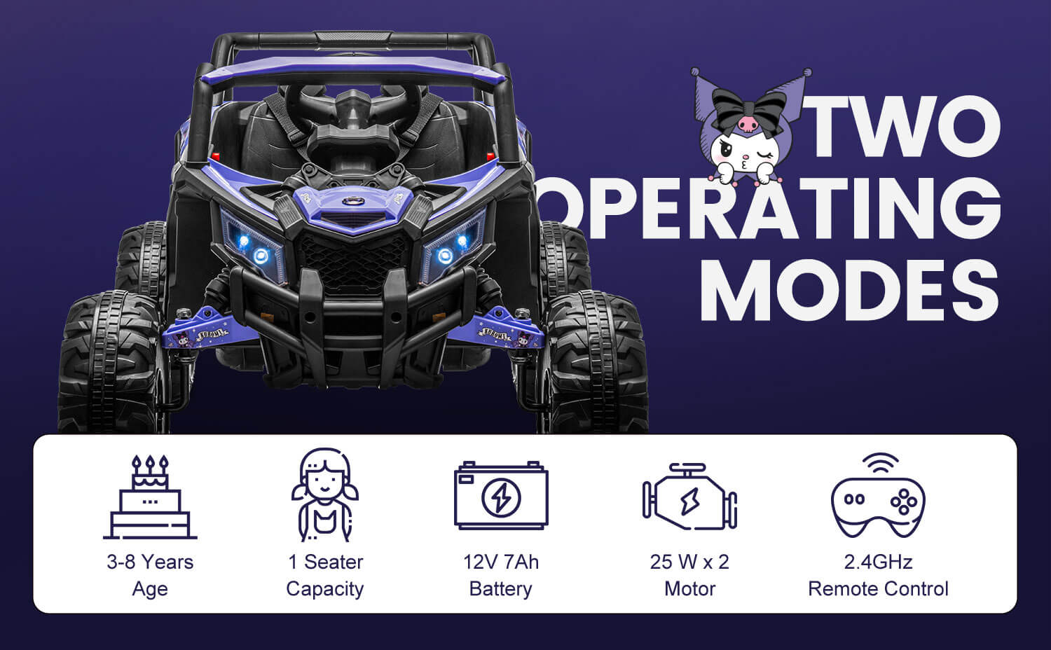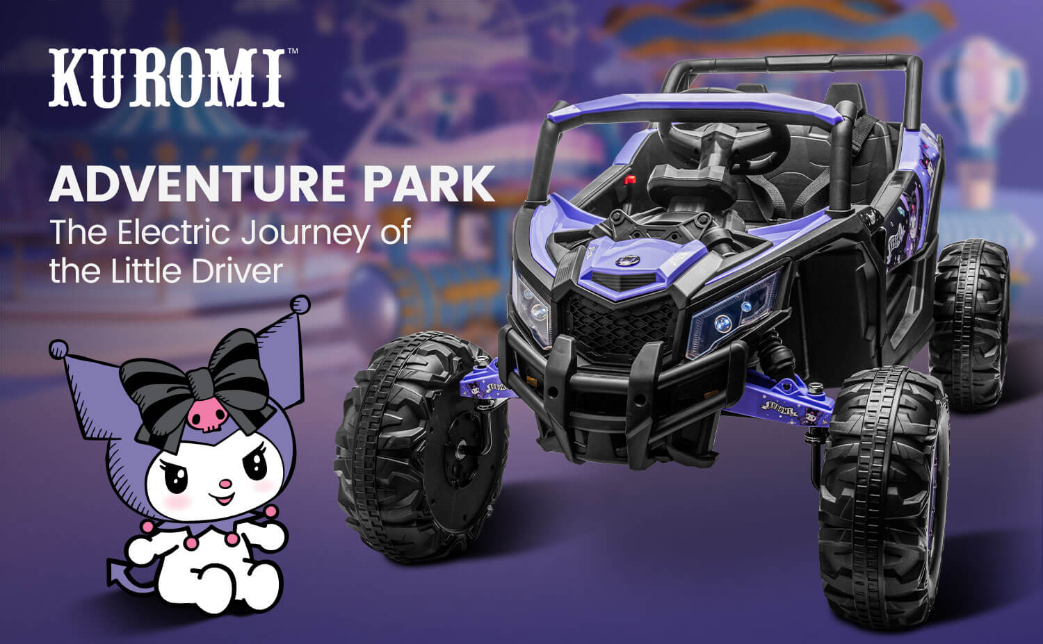 Kuromi Adventure UTV Design: This ride on car embodies the spirit of the Kuromi Adventure, making it a favorite among 12 volt ride on toys for boys and girls. It's the perfect combination of fun and adventure in a kids electric car.
