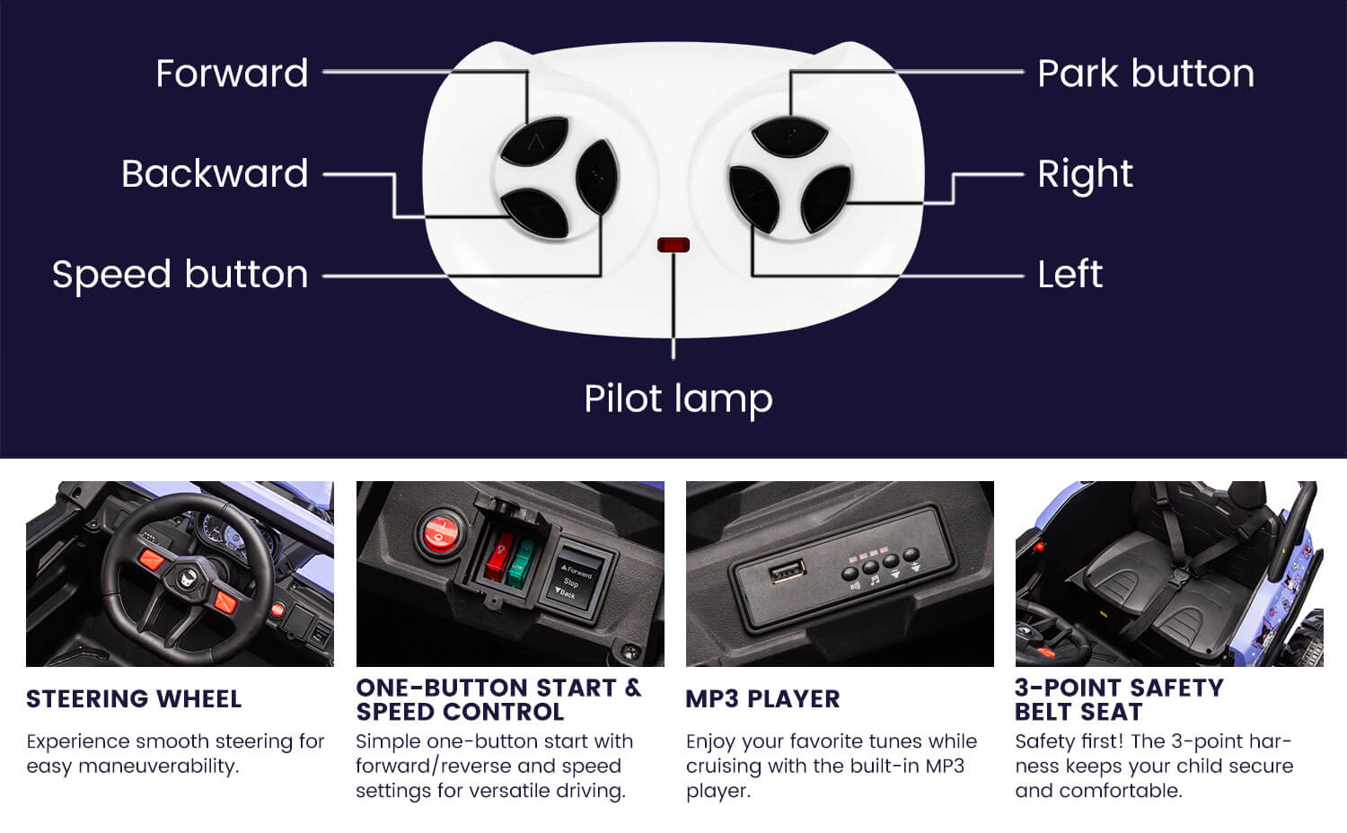 LED Lights and Seat Belt: Our kids' electric car is designed with safety in mind. It has LED lights for visibility and a seat belt for secure rides. It's more than just a kids car, it's a ride on toy with parental remote.