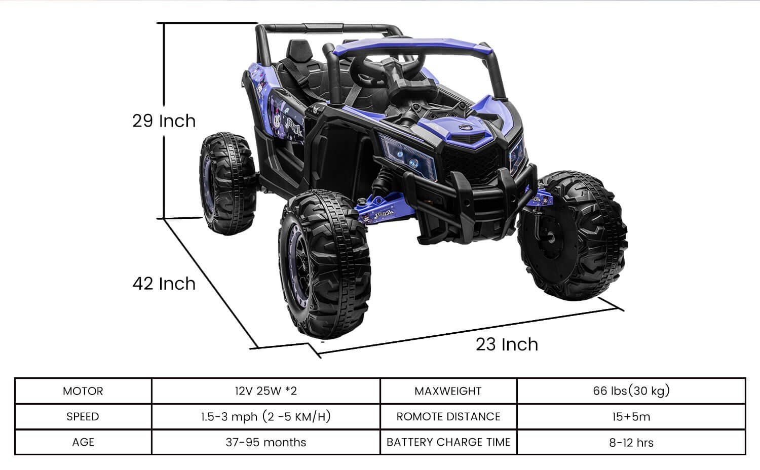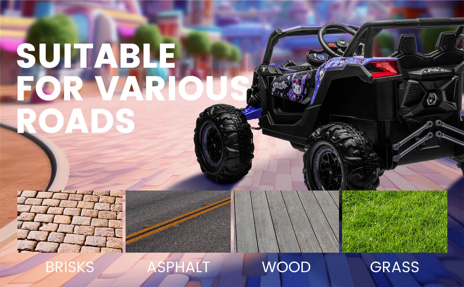 Powerful 12V Battery: This Kuromi Adventure UTV ride on car is equipped with a robust 12V battery and dual motors for a thrilling ride. It's the perfect Kids car toys for big kids' alternative, providing excitement and adventure for your little one.